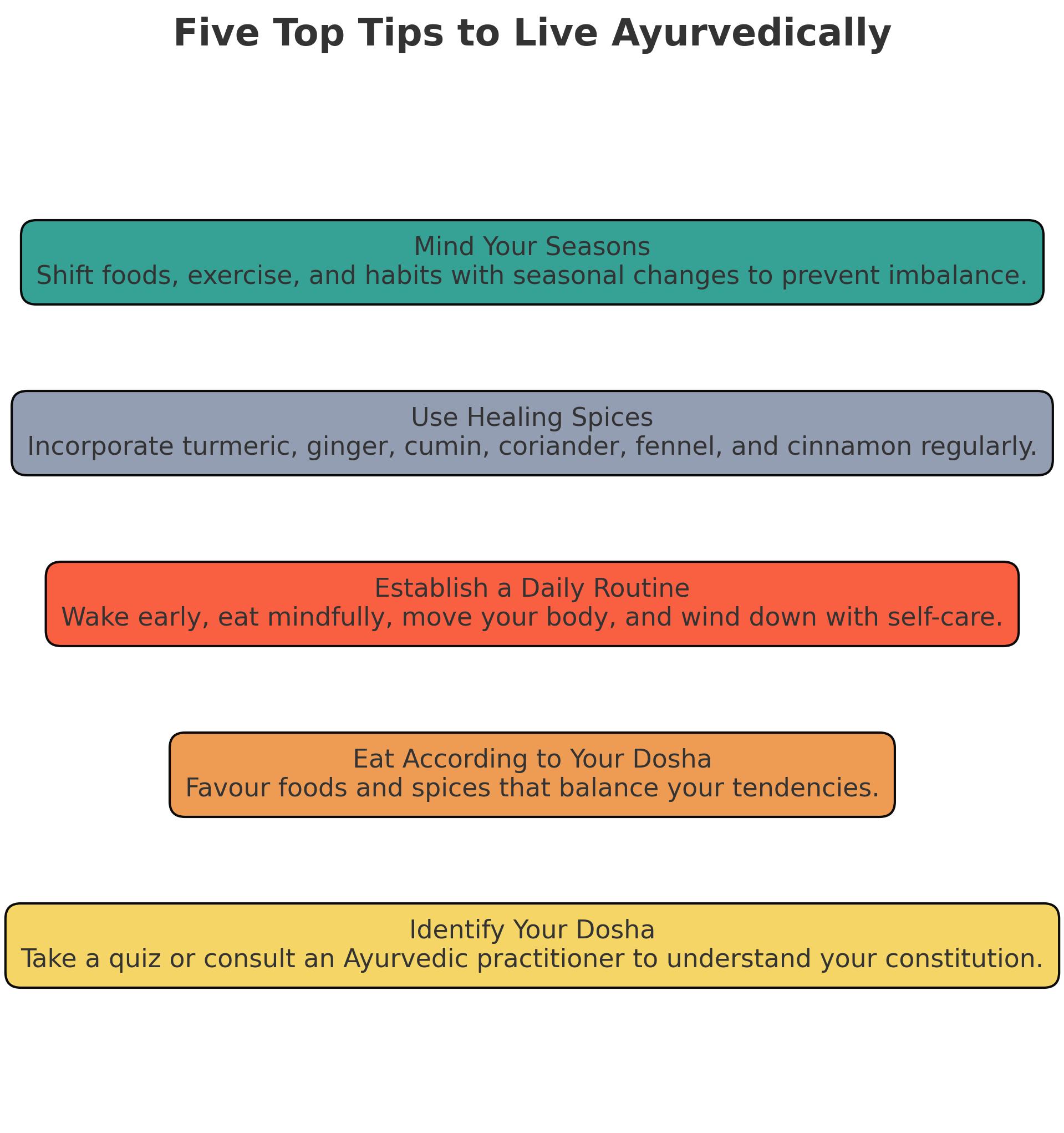 Adjust diet, activity, and self-care according to seasons to maintain dosha balance.