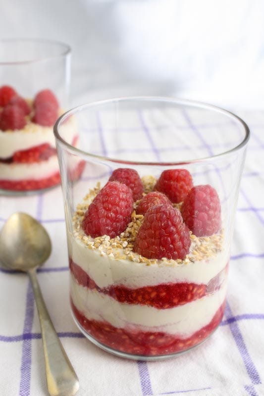 Layer the whipped coconut cream, toasted oats, and fresh raspberries in serving glasses, alternating each layer.